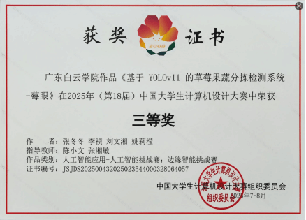 8月13日到17日,第18届中国大学生计算机设计大赛南京东决赛区在东北师范大学圆满落幕。南京东赛区包括了人工智能应用赛道和数媒动漫与短片赛道,广东白云学院大数据与计算机学院学子凭借优秀作品与出色表现在人工智能应用赛道荣获国家级三等奖,这一成绩不仅是对学生们专业技能的肯定,也反映了学校在AI应用人才培养方面的积极探索与实践。