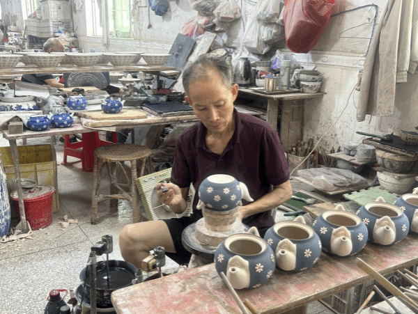 在大坑村村干部田庆生向我们介绍,通过抖音直播带货,网红汤勺一天可以卖出六七千个,多款网红爆款单品的年出货量高达300-400万件。“陶瓷产业的升级,要兼顾技术改造与数字营销。”特派员在考察后提出明确方向,利用 AI 数据分析海外市场偏好,定向开发欧美卡通餐具、东南亚实用型套装,挖掘“大埔青花瓷”手工彩绘工艺,推出“陶瓷+客家文化”文创伴手礼,推动产业从“制造”向“智造+文创”转型。