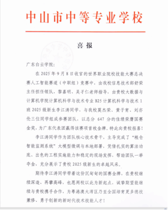 近日,广东白云学院大数据与计算机学院收到一封来自中山市中等专业学校的喜报。