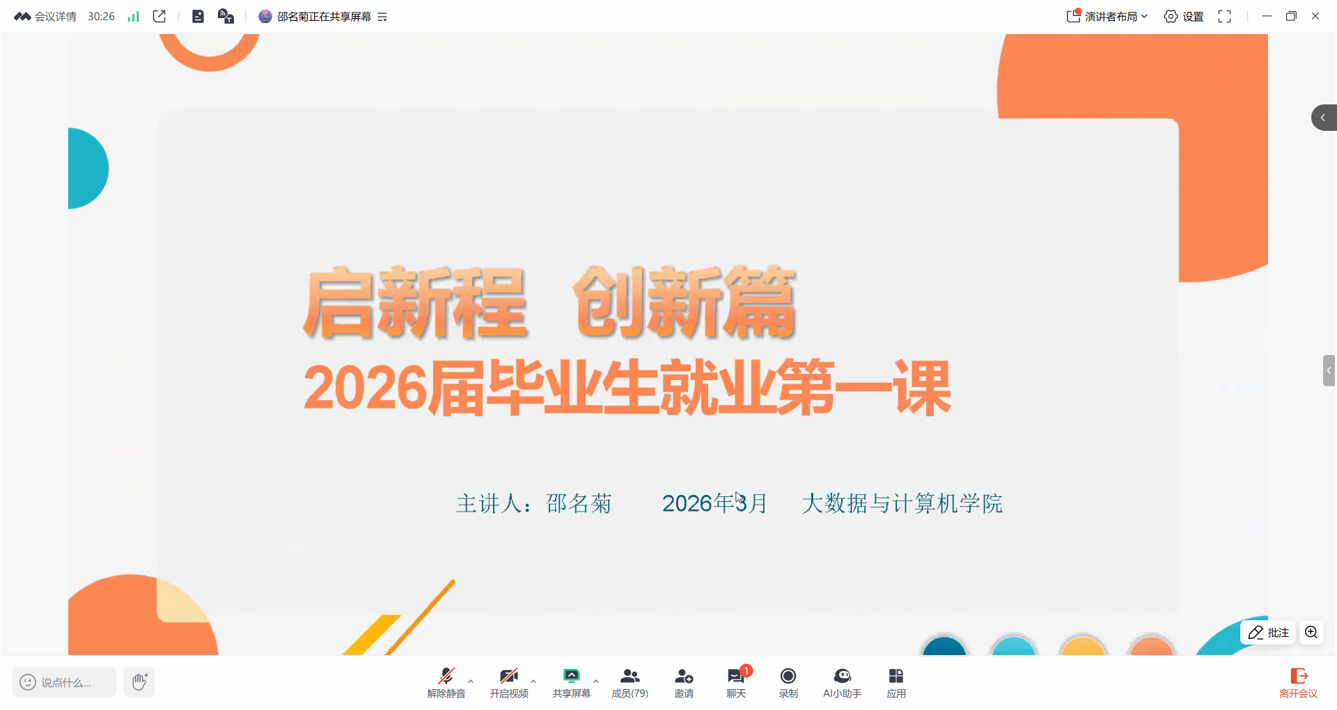助力2026届毕业生明晰就业形势、梳理求职思路,提升求职竞争力,3月4日晚上,大数据与计算机学院针对不同专业毕业班学生启动 “就业第一课” 系列专题会议。会议由大数据与计算机学院党委书记邵名菊主讲,学院辅导员、职业导师及计算机科学与技术专业专升本学生参与本次会议。