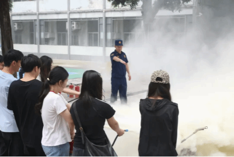 理论讲解结束后,全体人员前往学生 11、12 号楼旁篮球场开展实地灭火教学。在教官指导下,师生亲自动手操作灭火器进行实景灭火演练,将理论知识转化为实操技能,进一步提升了突发火情应急处置能力。