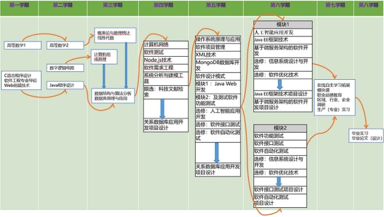 C语言程序设计、数据库原理与应用、计算机网络、操作系统原理与应用、Java程序设计、数据结构与算法分析、系统分析与建模工具、软件设计模式、基于微服务架构的软件开发、软件自动化测试。